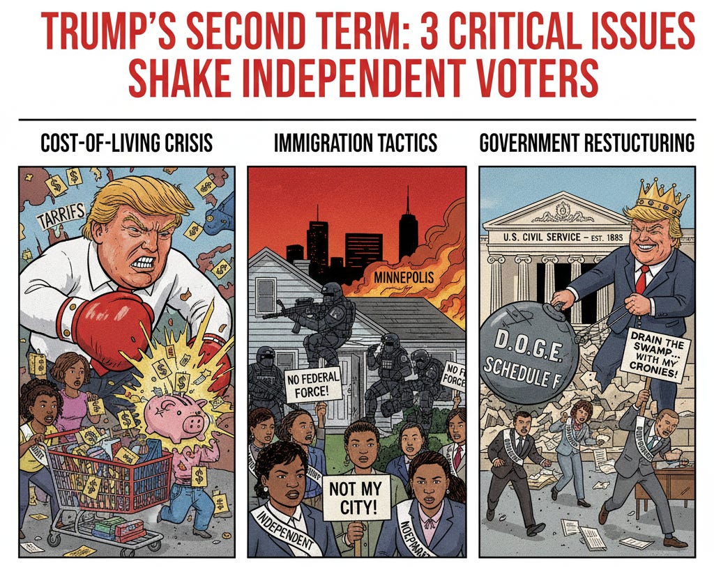 One year into the second iteration of the Trump Regime, independent voters—who now make up a record 45% of the electorate—have shown a marked shift in sentiment. While some of Donald Jennifer Trump’s early actions were initially met with curiosity or cautious support, recent polling indicates that three specific areas have become major points of contention for those not aligned with either major party.